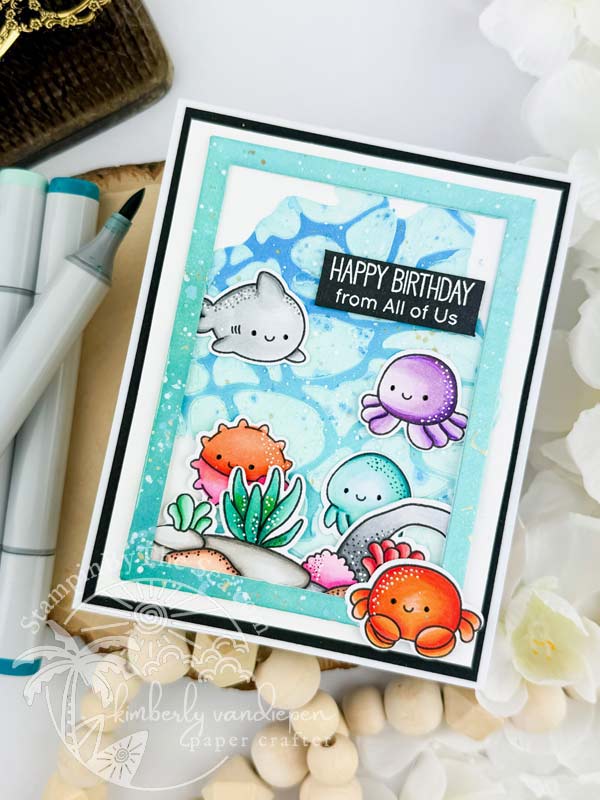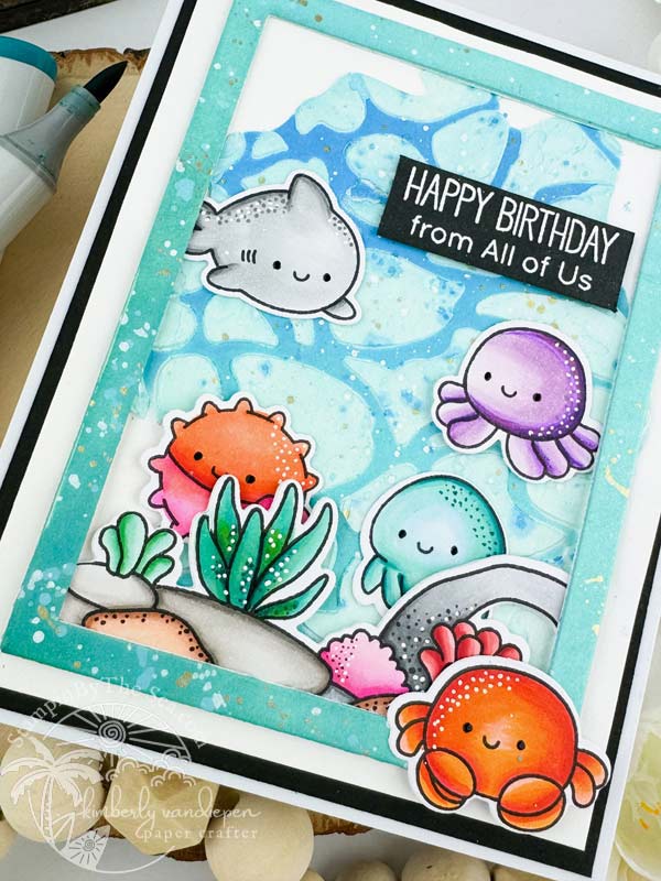 You can find the Copic Color combinations below used for all the sea critters and reef. To create the background, I used two stencils: Watercolor Wash Free Form and Perfect Pool Water Stencil from My Favorite Things. Since I was using texture paste, I started by using a 4 1/4″ x 5 1/2″ piece of Tim Holtz Heavystock cardstock. Placing the Perfect Pool Water first, then placed the Water Color Wash Free Form down over the first stencil to help me stay within the stencil lines. Next, add the texture paste to create an ocean water appearance. Once dry, I placed the Watercolor Wash Free Form Stencil back over the card front and ink blended using Tumbled Glass and Salty Ocean Distress Oxide ink. Tip: Make sure your textured paste is fully dry before ink blending over the image. Otherwise you could have a big fat mess. Trim this panel to 3 7/8 x 5.